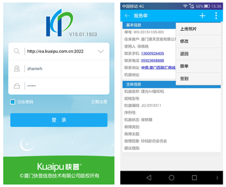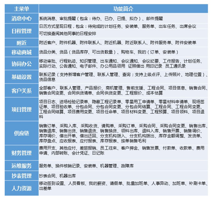 移動(dòng)服務(wù)接單、機(jī)器二維碼掃描、手機(jī)拍照定位、機(jī)器新增查詢、耗材查詢、客戶新增查詢、實(shí)時(shí)庫存查詢、知識(shí)庫查詢、應(yīng)收款及對帳、移動(dòng)辦公及審批等;
