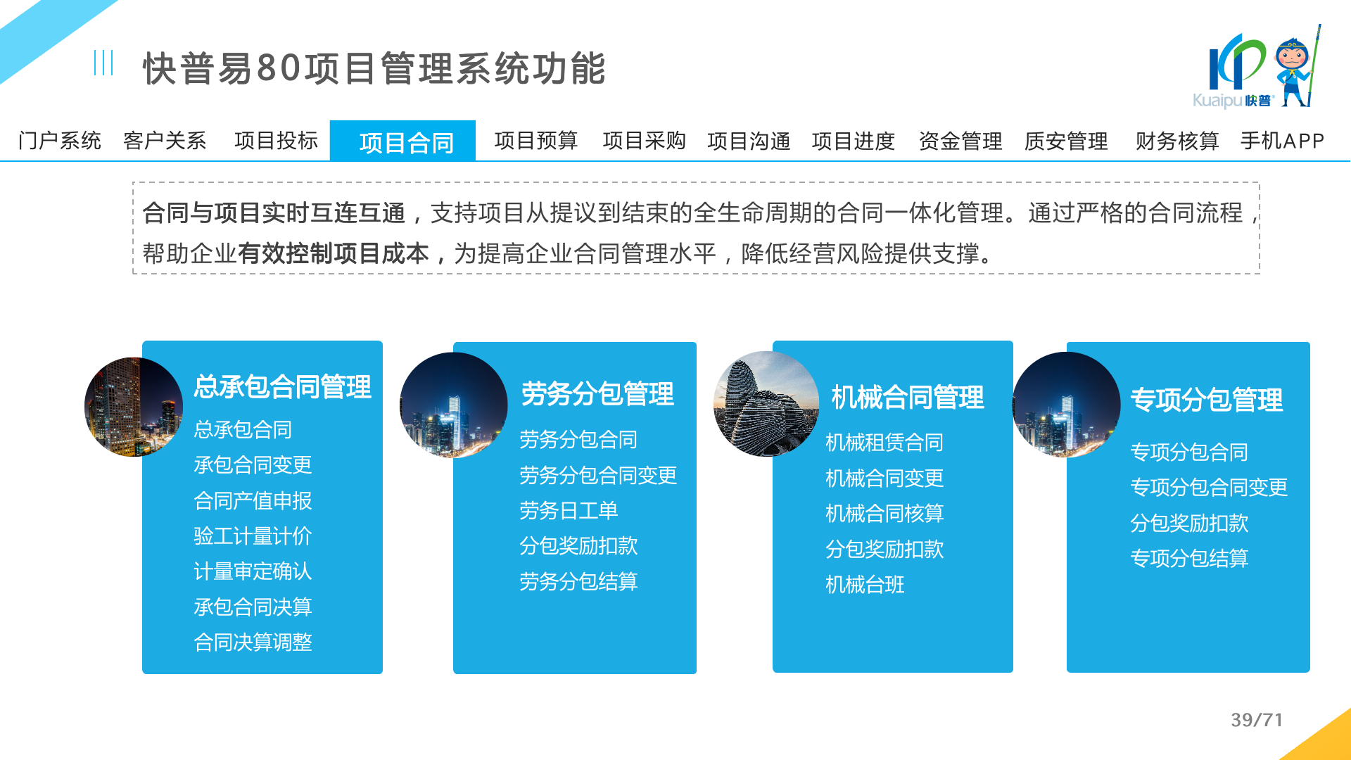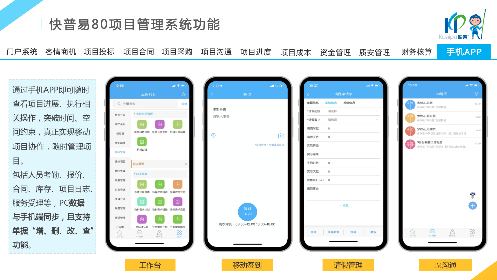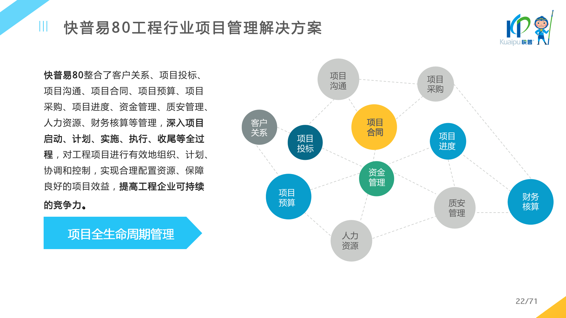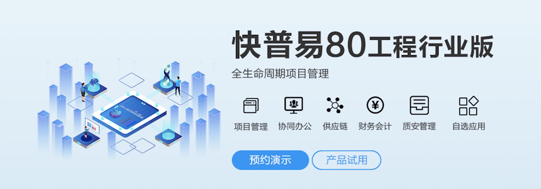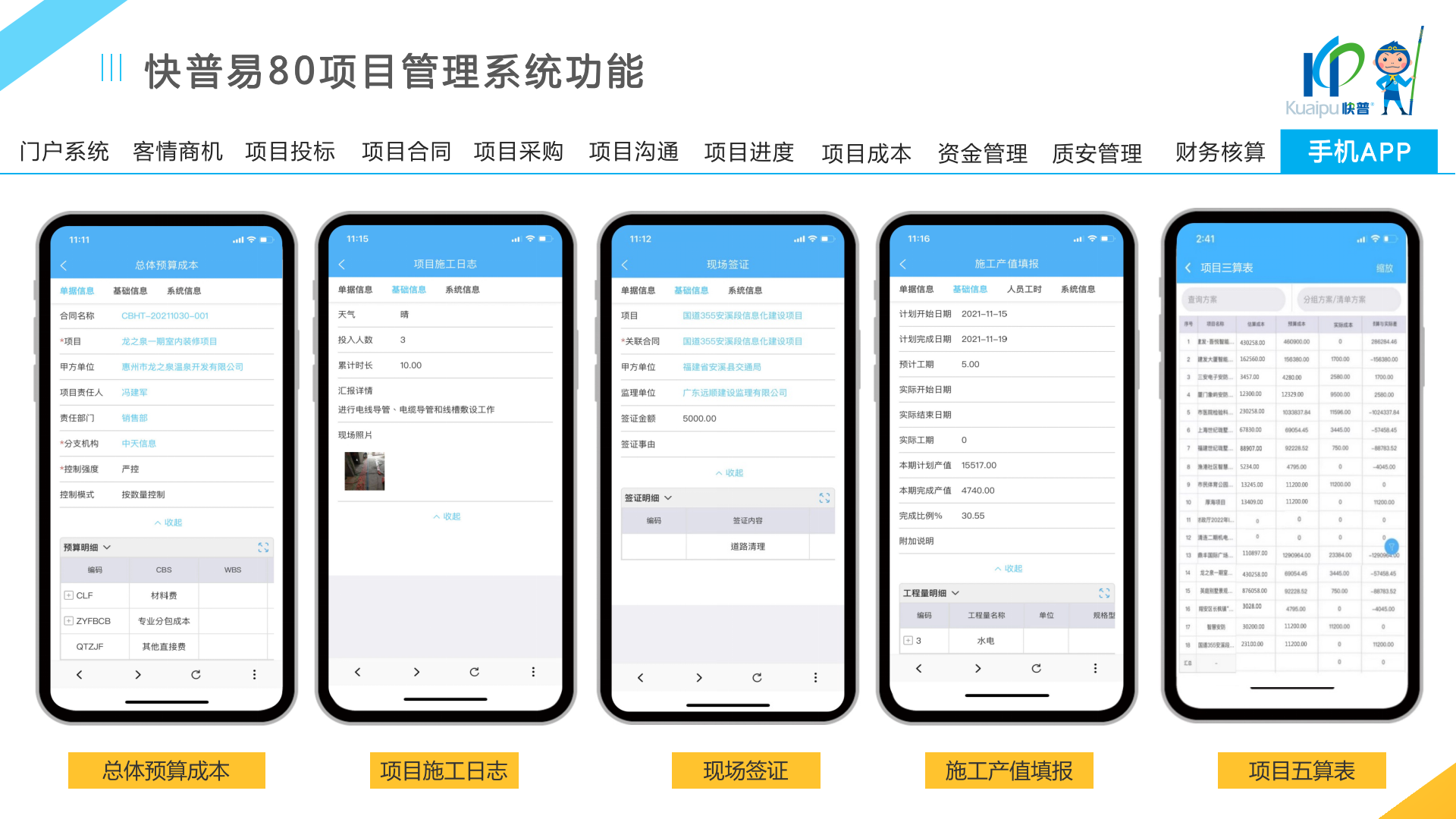 快普易80以項目管理為核心,通過“四控、四管、一協(xié)調(diào)”方式,對項目進(jìn)度、成本、資金、質(zhì)量安全進(jìn)行全面控制,實現(xiàn)投標(biāo)管理、合同管理、物資管理、預(yù)算管理等項目全生命周期項目的數(shù)字化管理,實現(xiàn)資源合理配置、保障良好的項目效益。