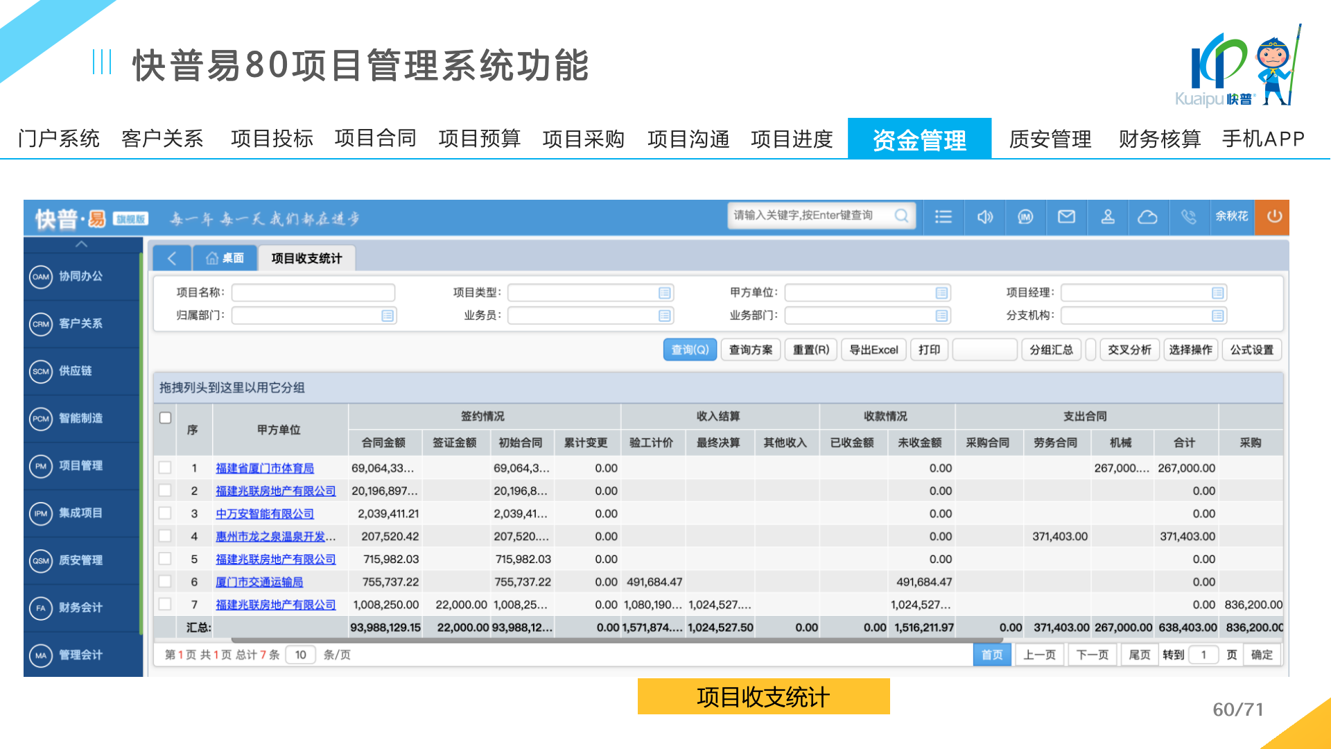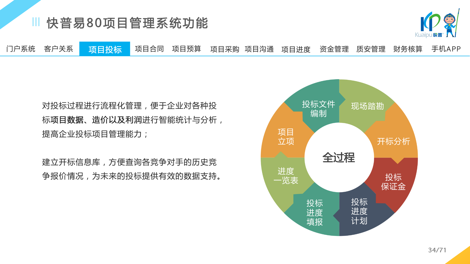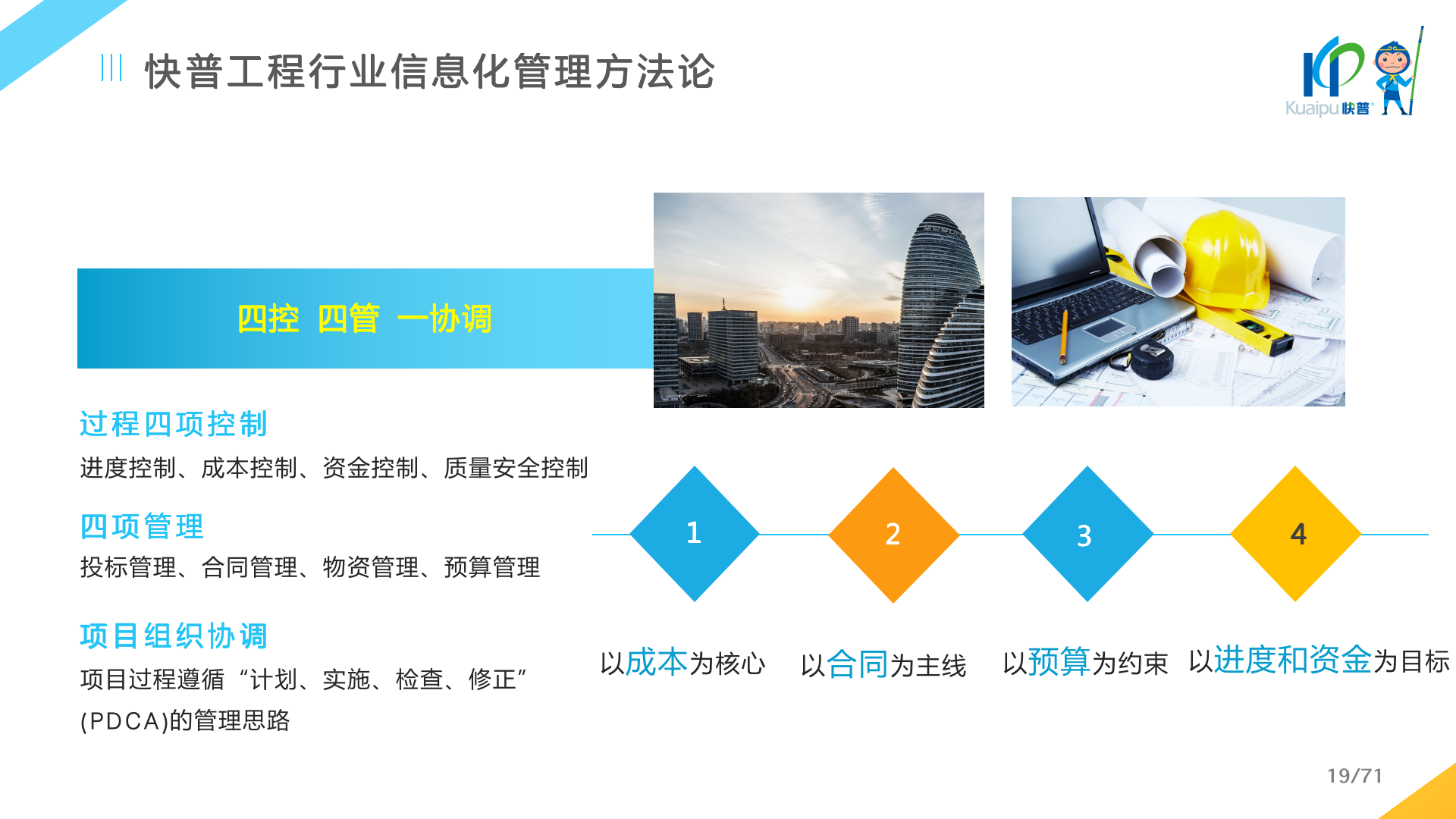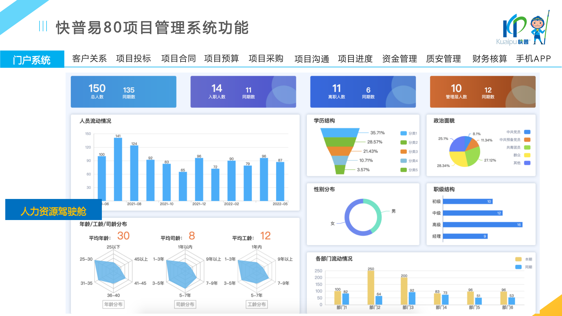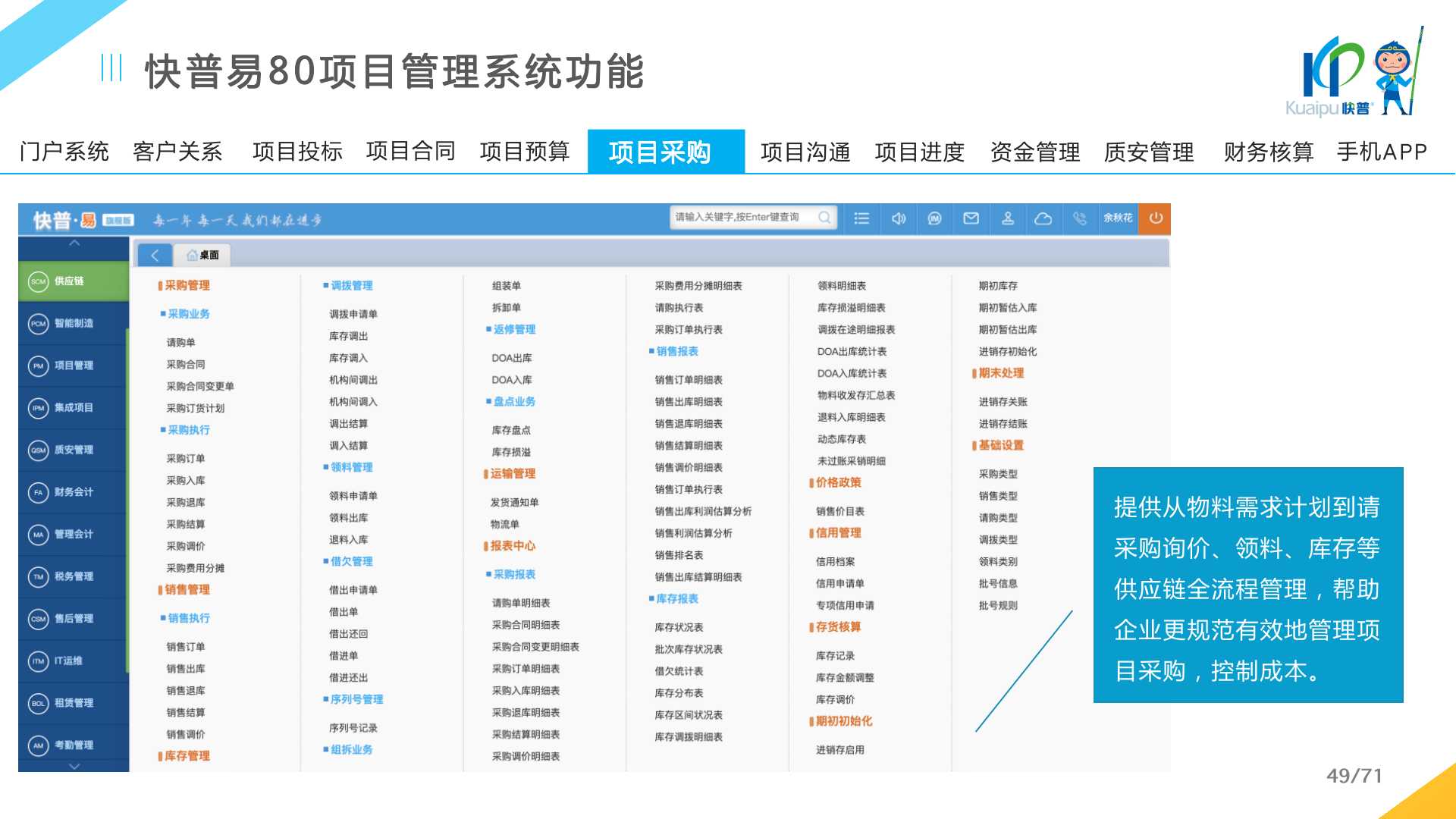 快普易80以項目管理為核心,通過“四控、四管、一協(xié)調(diào)”方式,對項目進(jìn)度、成本、資金、質(zhì)量安全進(jìn)行全面控制,實現(xiàn)投標(biāo)管理、合同管理、物資管理、預(yù)算管理等項目全生命周期項目的數(shù)字化管理,實現(xiàn)資源合理配置、保障良好的項目效益。