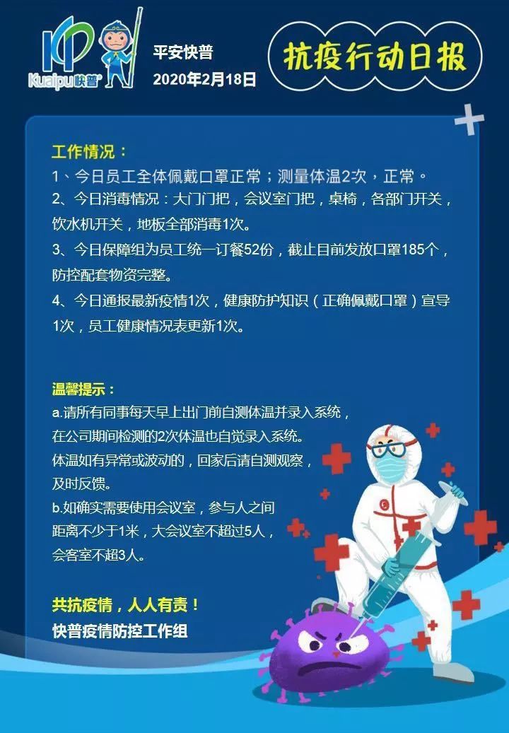 快普疫情防控工作組堅(jiān)持“查、防、控”三大原則,嚴(yán)格遵循制度、規(guī)范開(kāi)展工作,兢兢 業(yè)業(yè),全員上下一心,共同建設(shè)“平安快普”。