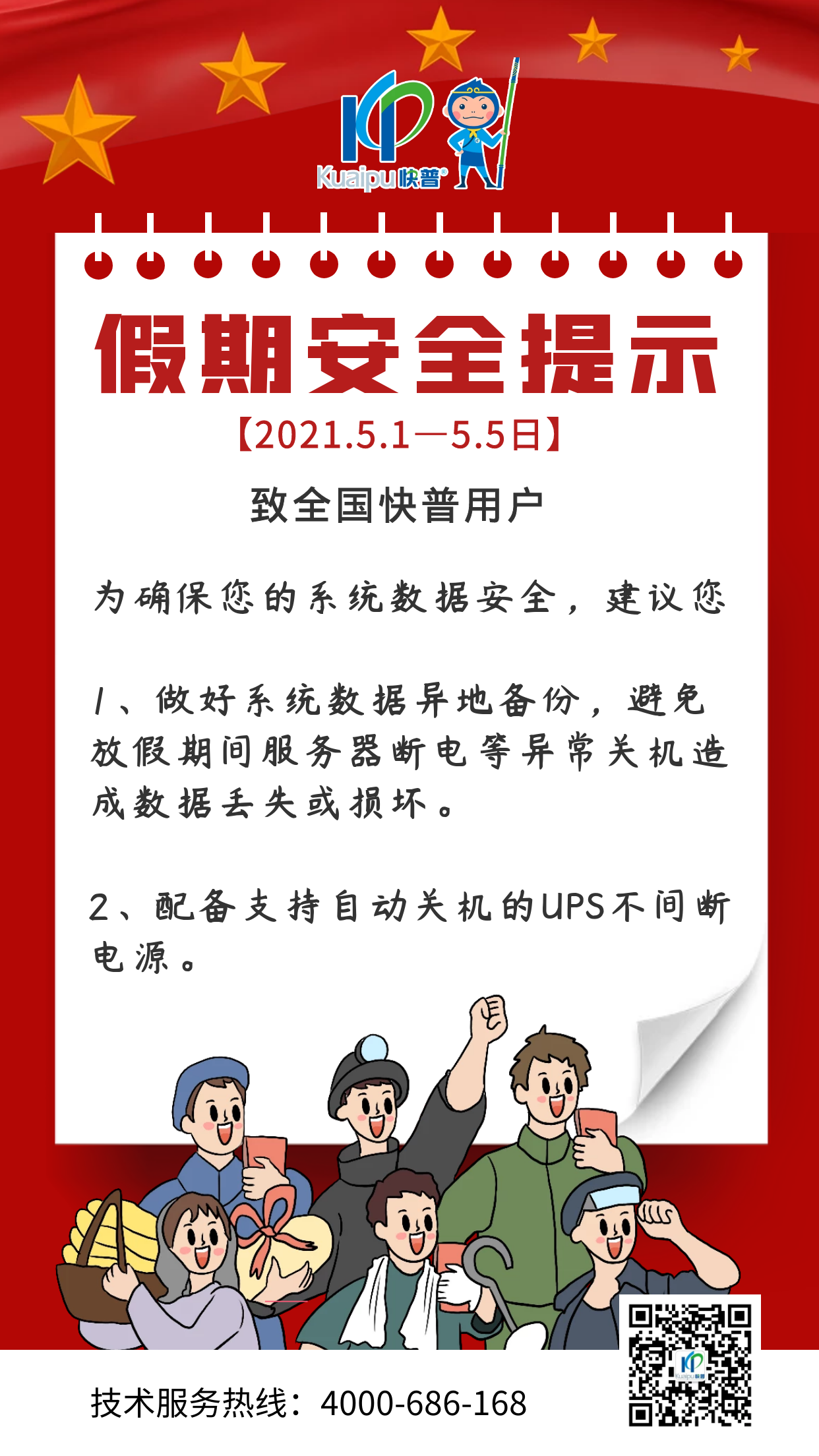 在此也特別提醒您:放假期間注意快普系統(tǒng)數(shù)據(jù)安全,最好將整個(gè)快普數(shù)據(jù)做一下異地備份,以免放假期間服務(wù)器斷電等異常關(guān)機(jī)造成數(shù)據(jù)丟失或損壞,盡量配備下支持自動(dòng)關(guān)機(jī)的UPS不間斷電源。
