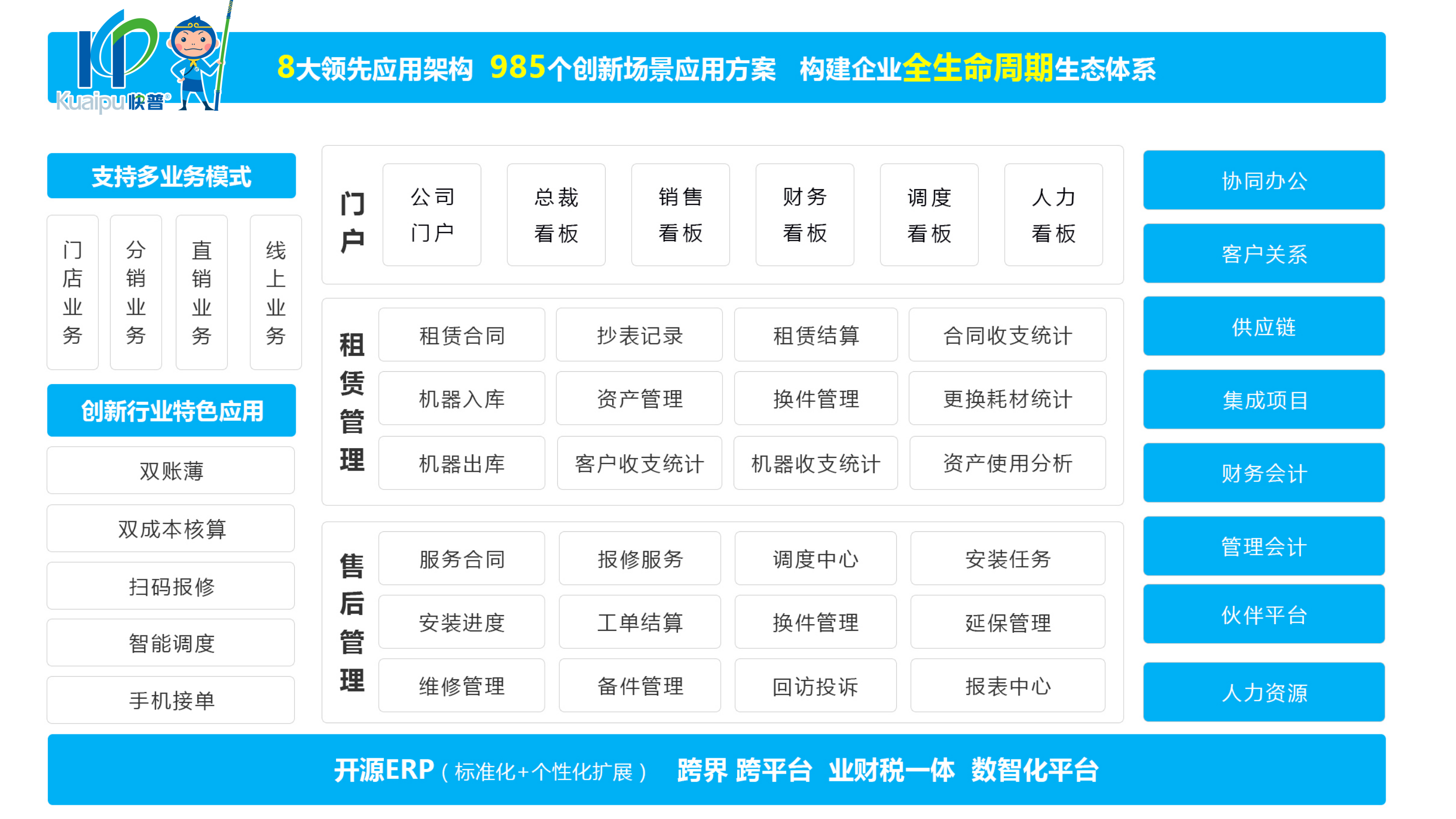 快普易30為OA企業(yè)提供多業(yè)務(wù)模式統(tǒng)一管理平臺(tái),創(chuàng)新“雙賬薄、雙成本核算”管理,支持“掃碼報(bào)修、智能調(diào)度、手機(jī)接單”等移動(dòng)互聯(lián)網(wǎng)應(yīng)用。營(yíng)銷端全渠道連接客戶,供應(yīng)鏈全流程無縫協(xié)同,服務(wù)端跨界、跨平臺(tái)融合,多維度打通企業(yè)生態(tài)鏈,實(shí)現(xiàn)業(yè)財(cái)稅一體化,全流程、全生命周期的降本增效。