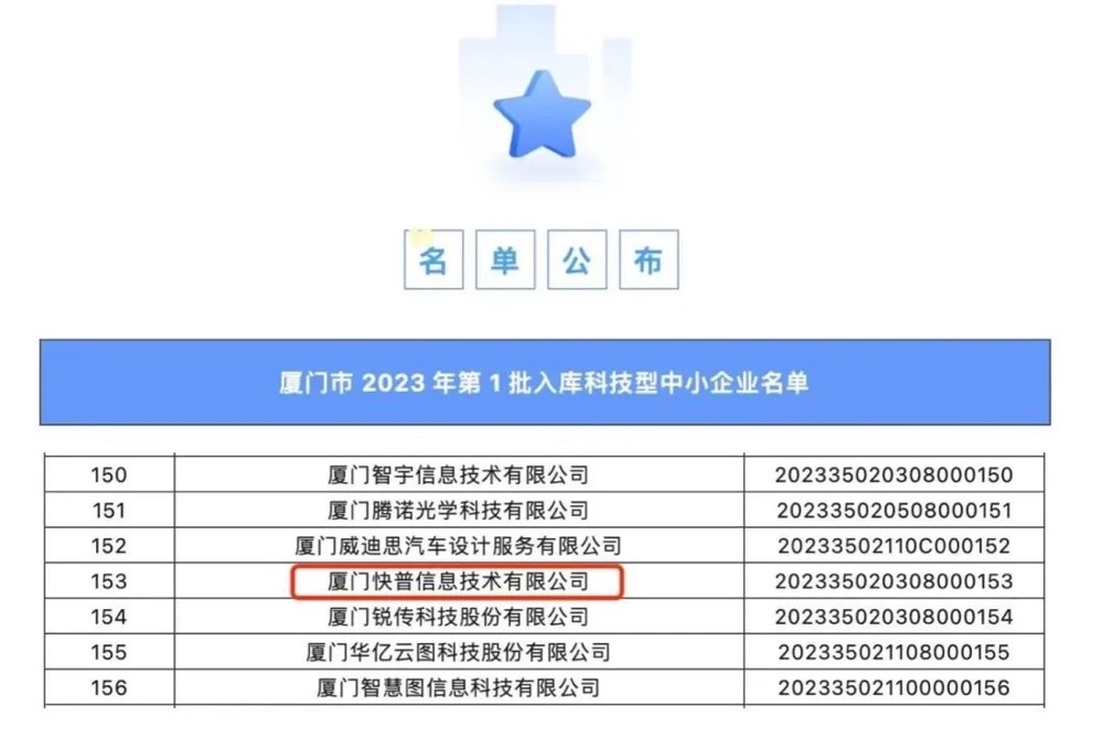 繼“廈門市創(chuàng)新型中小企業(yè)”認定后,快普再傳捷報!近日,廈門市科技局發(fā)布了《2023年第一批入庫科技型中小企業(yè)名單》,快普赫然在列。該項評定意味著快普的技術(shù)成果、科技含量、創(chuàng)新能力等方面獲得了政府相關(guān)部門的充分肯定,同時也表明快普在科技創(chuàng)新、技術(shù)研發(fā)和知識產(chǎn)權(quán)保護方面邁上了一個新的臺階。