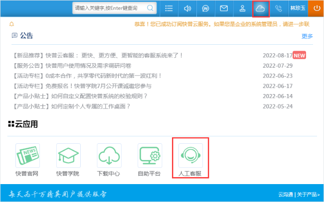 第一步: 用戶(管理員權(quán)限才可以哦)通過快普系統(tǒng)→云服務(wù)→人工客服,即可發(fā)起咨詢