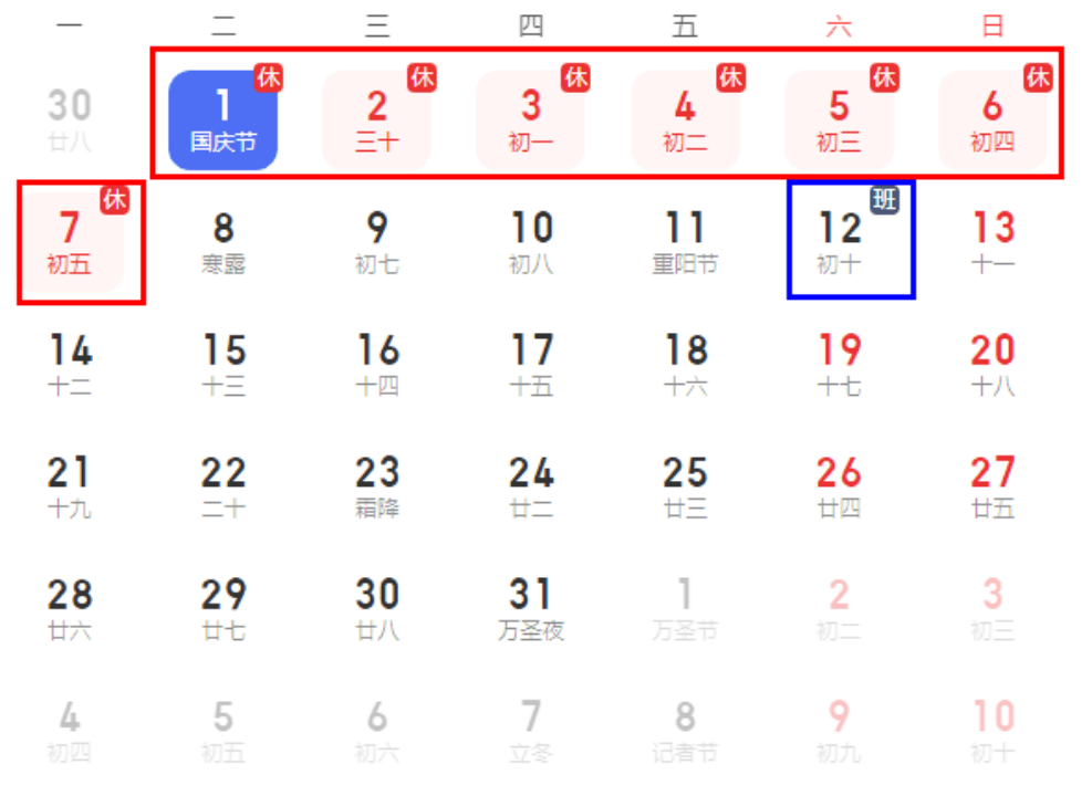 “藍(lán)色框”為補(bǔ)班時(shí)間、“紅色框”為放假時(shí)間: