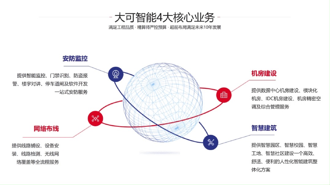 大可智能在行業(yè)內(nèi)率先提出“零分包”管理模式,并且自主要求每一個(gè)實(shí)施員工執(zhí)行公司制定的標(biāo)準(zhǔn)化施工規(guī)范,有效降低工程的成本,提高運(yùn)轉(zhuǎn)效率,為客戶提供更高效的咨詢、規(guī)劃、設(shè)計(jì)、施工、運(yùn)維一站式的解決方案。