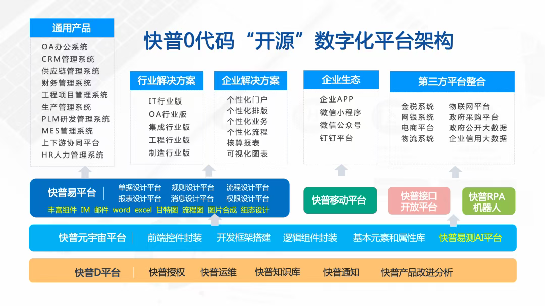 為此,快普依托自主研發(fā)的“快普易”整合管理平臺(tái),以先進(jìn)的技術(shù)架構(gòu)為企業(yè)提供簡單、靈活的應(yīng)用體驗(yàn)。平臺(tái)具備零代碼配置、多系統(tǒng)無縫整合、AI深度嵌入等核心優(yōu)勢,為企業(yè)提供一條“小快輕準(zhǔn)”的數(shù)字化轉(zhuǎn)型路徑: