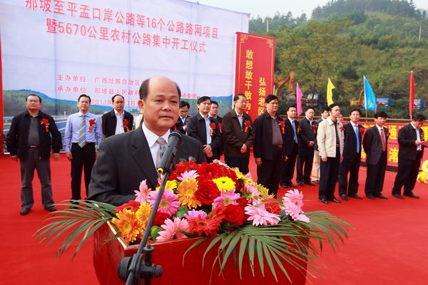為貫徹落實自治區(qū)黨委、政府在全區(qū)掀起項目建設(shè)新高潮的決策部署,沖刺第四季度,完成全年公路建設(shè)目標(biāo)任務(wù),自治區(qū)交通運(yùn)輸廳于11月3日舉行全區(qū)公路路網(wǎng)改造項目集中開工儀式。由集團(tuán)公司承辦的分會場——那坡至平孟口岸公路等16個公路路網(wǎng)項目暨5670公里農(nóng)村公路集中開工儀式在百色市那坡縣德隆鄉(xiāng)隆重舉行。自治區(qū)交通運(yùn)輸廳紀(jì)檢組長、廳黨組成員朱名勝,百色市市委常委、政法委書記周武紅,市人大常委會黨組成員黃五同,集團(tuán)公司黨委書記、董事長朱堅和、總經(jīng)理李定倫、黨委副書記張友坐、副總經(jīng)理劉明洪、總工程師覃炳賢,自治區(qū)公路管理局、百色市公路管理局、交通運(yùn)輸局、那坡縣四家班子、集團(tuán)公司直屬各單位領(lǐng)導(dǎo)及有關(guān)部門負(fù)責(zé)人等出席開工儀式。