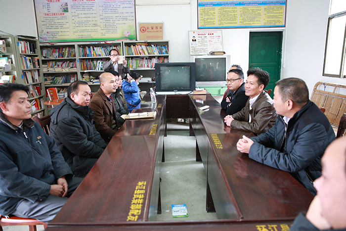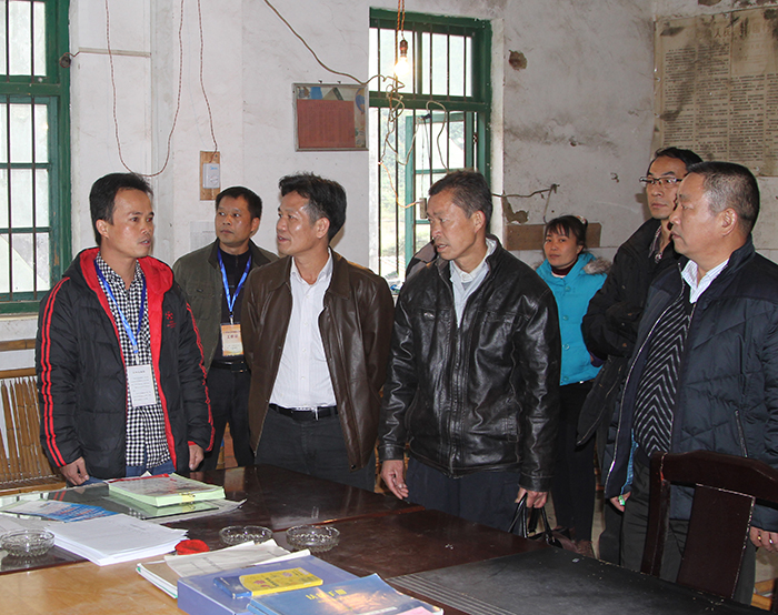 集團(tuán)公司朱堅和董事長(左三)、張友坐副書記(右一)聽取駐村”第一書記“梁義寬匯報工作。 在相堯村、豹山村、才帛村,朱堅和董事長分別與當(dāng)?shù)劓?zhèn)、村干部以及覃獻(xiàn)康、梁義寬、蔣博三位派駐農(nóng)村“第一書記”和扶貧工作隊隊員進(jìn)行親切交談,詳細(xì)詢問“第一書記”工作、生活情況,并聽取了“第一書記”關(guān)于幫扶村的黨建及村集體經(jīng)濟(jì)發(fā)展情況匯報。得知目前各駐村書記及扶貧工作隊員已經(jīng)完成精準(zhǔn)扶貧入戶摸底調(diào)查時,朱堅和董事長對“第一書記”到村以來,深入調(diào)查走訪,積極幫助村里理思路、定規(guī)劃、辦實(shí)事,表示充分肯定。
